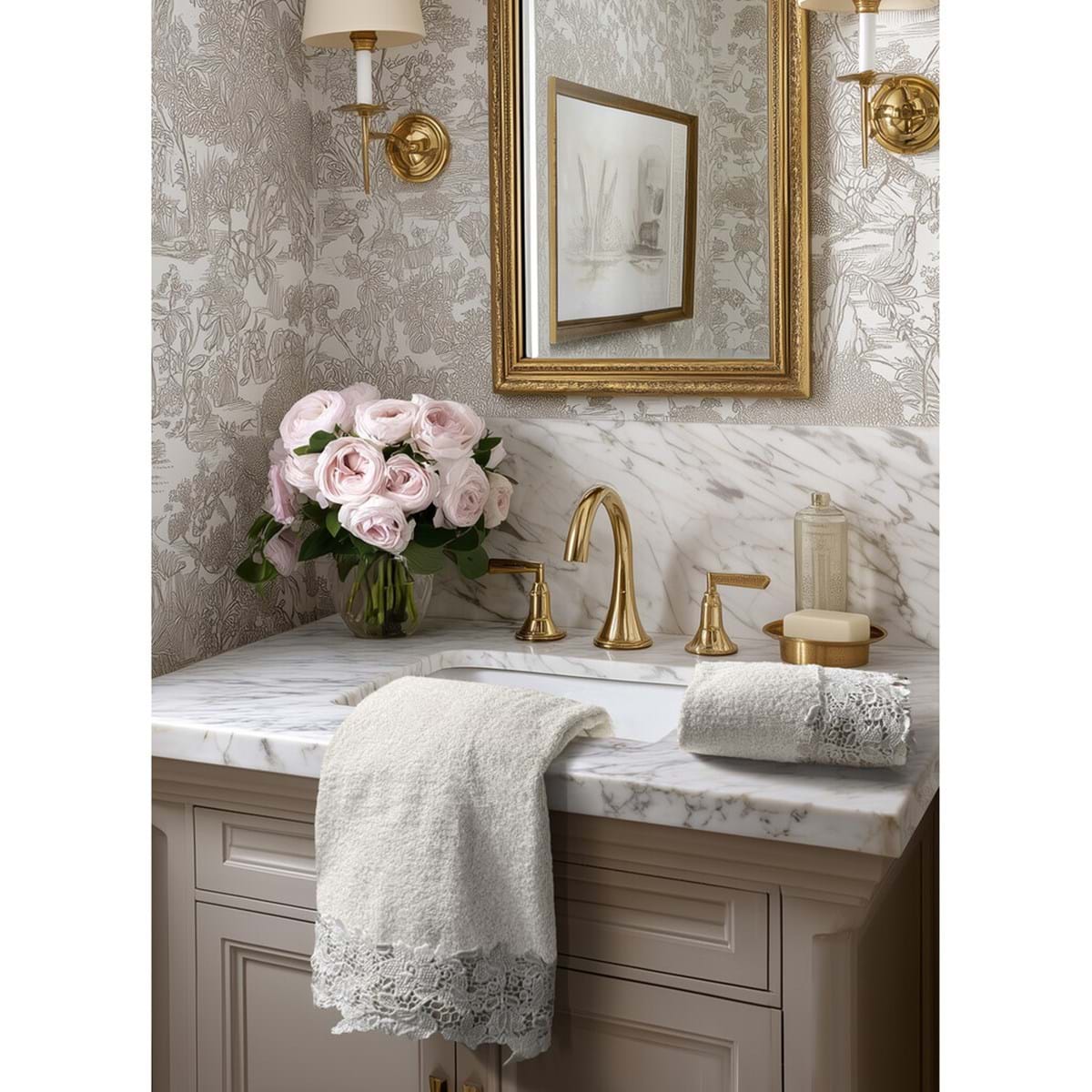Dodaj odrobinę elegancji do swojej łazienki dzięki temu pięknemu kompletowi kremowych ręczników, ozdobionych wyrafinowaną koronkową aplikacją. Delikatnie naszyta koronka dodaje romantycznego i wyrafinowanego uroku, zmieniając codzienny przedmiot w ponadczasowy element dekoracyjny. Z kolekcji Merletto marki BlancMariclò. Gęsty i ścisły splot włókien. Świetnie wchłania wodę. Przyjemny w dotyku. Wysoka jakość wykonania.