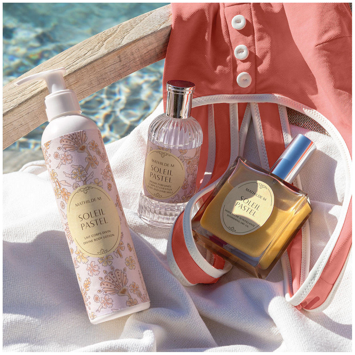 Delikatny szum fal kołyszących ją, ciepły piasek pod jej stopami, pyszny zapach kremu rozpływający się na jej złotej skórze... Zamknij oczy i pozwól, by porwał cię ciepły zapach Soleil Pastel. Egzotyczne i słoneczne nuty kwiatu tiarę i kokosa łączą się z subtelną słoną morską bryzą. W tle kremowy akord wanilii i paczuli otula nas miękkością. Zapach przywodzący na myśl lato, rozgrzewający ciało i umysł.