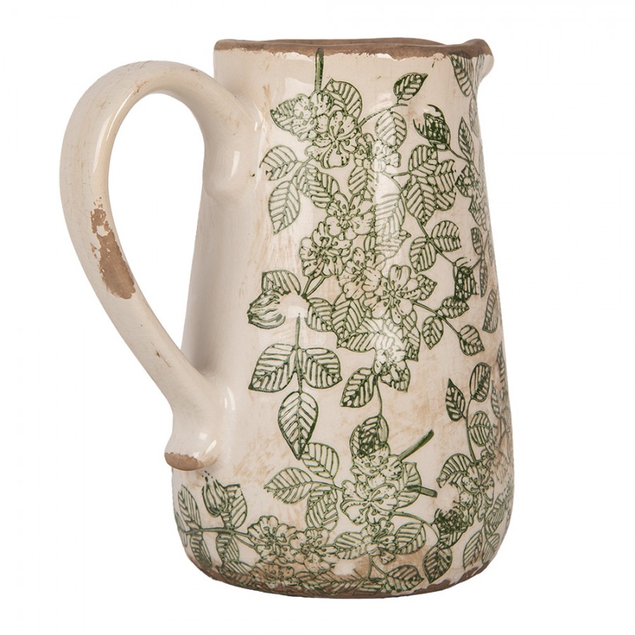 Piękny ceramiczny dzbanek dekoracyjny w kolorze beżowym, z motywem zielonych kwiatów i zielonych liści, w wiejskim stylu. Możesz użyć dzbanka jako dekoracji lub umieść w nim ładne suszone kwiaty. Klimatyczny w domu lub w ogrodzie. Dzban nie jest wodoodporny, więc użyj innego wazonu lub szklanki, jeśli chcesz umieścić w nim ładny bukiet.