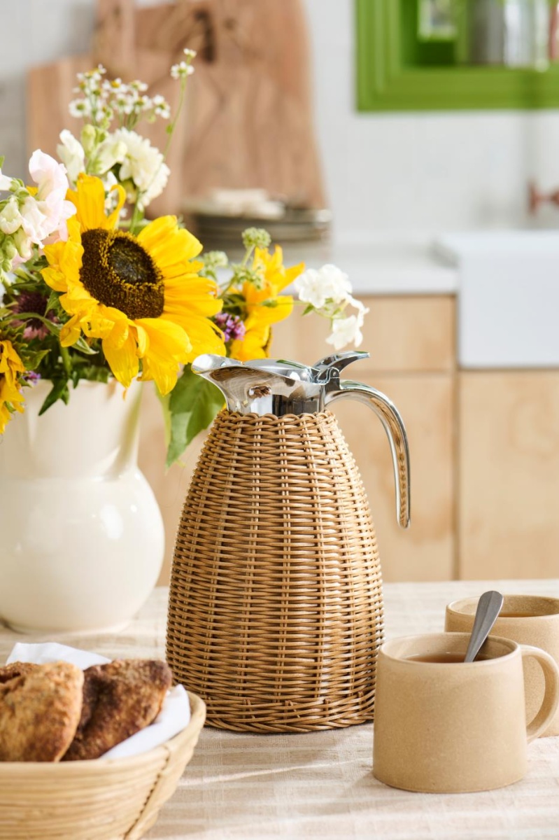 Uroczy termos ze stali nierdzewnej, elegancko zapakowany w naturalny, brązowy, ręcznie tkany polirattan. Duża pojemność 1,5 litra utrzymuje kawę lub herbatę gorącą przez wiele godzin – idealny do codziennego użytku i dla gości.Wyjątkowy termos z rattanowym oplotem, doda Twojemu stolikowi kawowemu wyrafinowania i elegancji. Posiada praktyczne walory, dzięki czemu idealnie nadaje się równie do przechowywania gorących napojów jak i zimnych. Poręczny oraz wygodny uchwyt spełni swoją rolę w wygodnym użytkowaniu tego dzbanka, zamykany klapką z silikonowym wykończeniem. Z pewnością przyda się jednakowo w pracy lub na weekendowe wypady poza miasto.