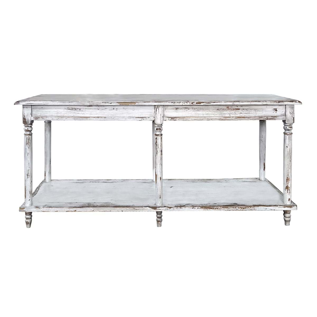 Ponadczasowa konsola z historią w klimacie shabby chic. Mebel został postarzony techniką tworzenia postarzanych mebli i dekoracji poprzez malowanie kilkoma warstwami farby. Następnie celowe ich przecieranie, by wydobyć spodnie warstwy i nadać przedmiotom wygląd zużytych, ale wciąż eleganckich. Posiada praktyczne półki. Wyjątkowy oraz funkcjonalny mebel do wnętrz inspirowanych stylistyką francuską. Solidne wykonanie.