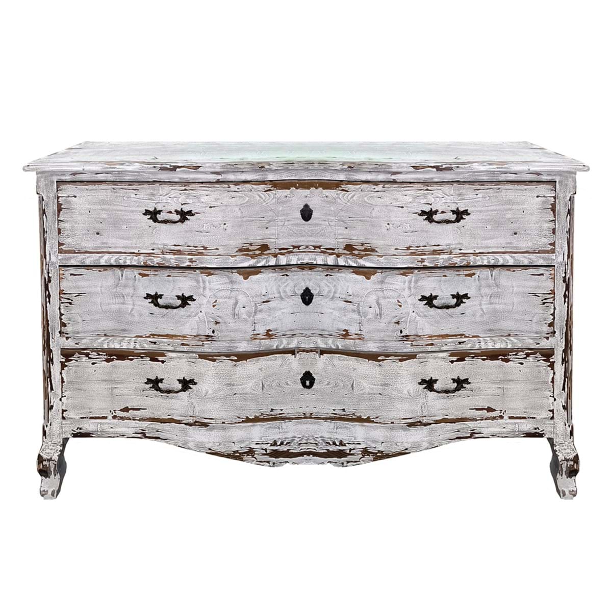 Ponadczasowa komoda z historią w klimacie shabby chic. Mebel został postarzony techniką tworzenia postarzanych mebli i dekoracji poprzez malowanie kilkoma warstwami farby. Następnie celowe ich przecieranie, by wydobyć spodnie warstwy i nadać przedmiotom wygląd zużytych, ale wciąż eleganckich. Posiada trzy praktyczne szuflady. Wyjątkowy oraz funkcjonalny mebel do wnętrz inspirowanych stylistyką francuską. Solidne wykonanie.