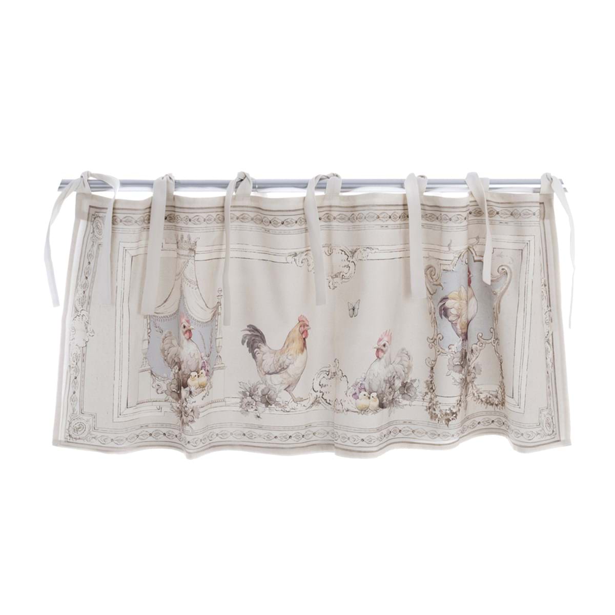 Wyjątkowej urody, lambrekin zdobiony nadrukiem kury i koguta, z wyjątkowym wzornictwem. Projekt przywołuje rustykalny i elegancki nastrój, idealny do wnętrz w stylu skandynawskim. Wzór wykończenia dodaje eleganckiego, dekoracyjnego akcentu. Idealny, aby uzyskać świeży i zachęcający wygląd w każdym otoczeniu.