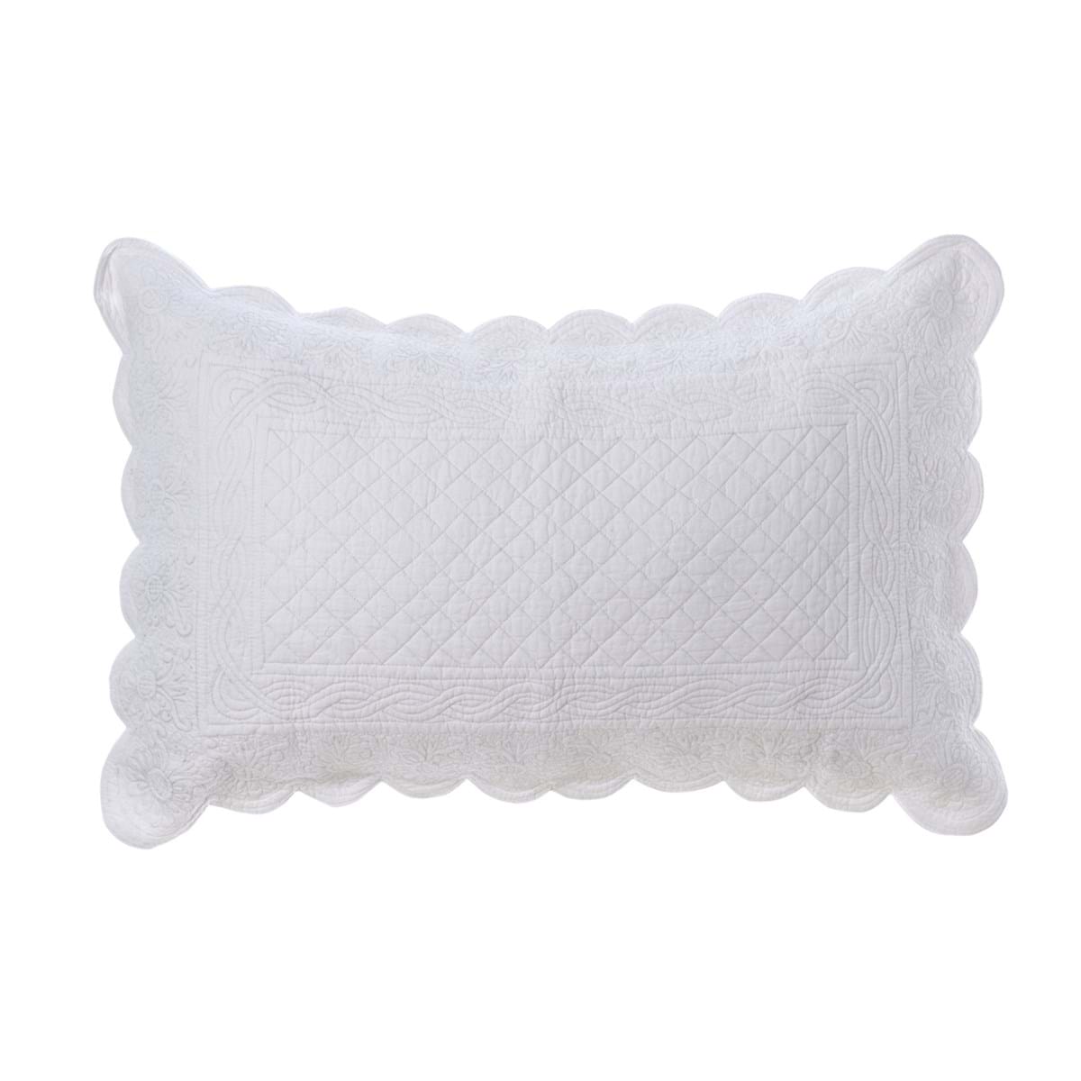 Romantyczna biała, prostokątna poduszka wykonana techniką boutis przez Blanc MariClo. Wykonana z bawełny ozdobiona subtelnym motywem. Praktyczna dekoracja do wnętrz utrzymanych w stylu francuskim. Sprzedawana bez wypełnienia.