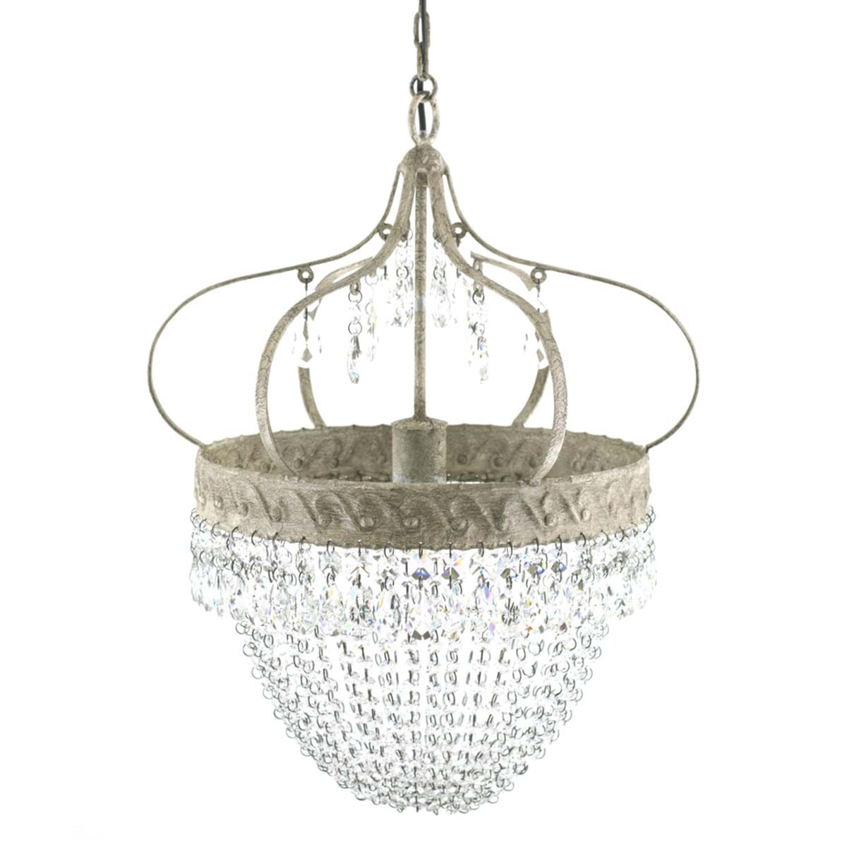 Wisząca lampa z trzema światłami wykonana z metalu i szkła. Antyczna metalowa konstrukcja ozdobiona jest eleganckimi soplami i dekorami, dodając wyrafinowanego i wyrafinowanego akcentu. Idealna do wzbogacania przestrzeni o czarujący i klasyczny styl.