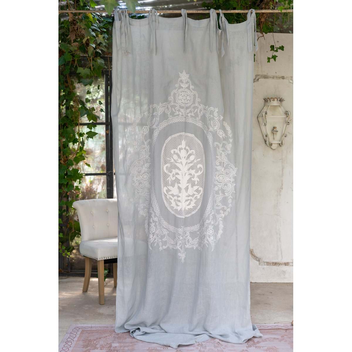 Ekskluzywna zasłona uszyta z lnu. W eleganckim pudrowo-niebieskim odcieniu z domieszką szarości, wzbogacona centralnym, białym haftowanym medalionem, który wyróżnia się na tle naturalnej tkaniny. Wiązania dodają praktyczności i romantycznego akcentu, idealnie nadając elegancji i blasku klasycznym wnętrzom lub wnętrzom w stylu shabby chic. Zasłona idealnie filtruje światło słoneczne. Posiada elegancki, wyrafinowany charakter. Autentycznie odzwierciedla klimat dawnych czasów. Ozdobiona misternym haftem. Jest piękna i niepowtarzalna.