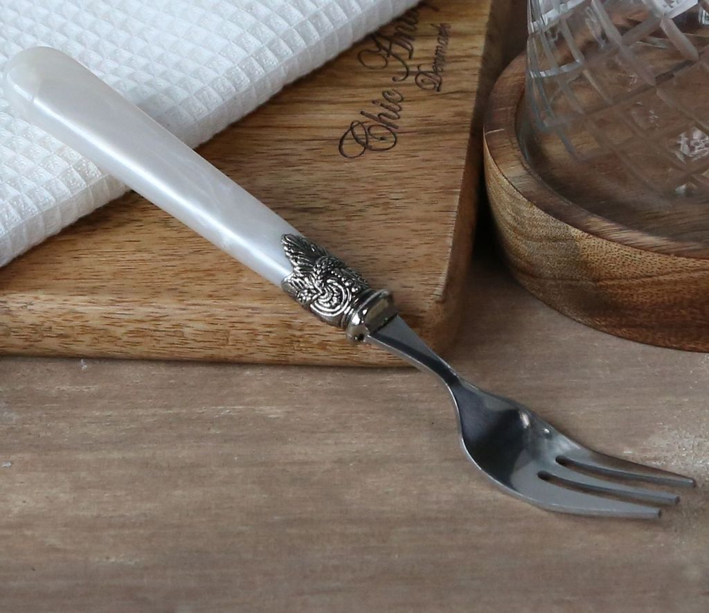 Widelczyk deserowy z poręcznym uchwytem w stylu prowansalskim. Stal nierdzewna sztućców ładnie kontrastuje z uchwytami o wyglądzie masy perłowej. Zestaw pięknie prezentował się będzie jako nakrycie stołu w klimatycznej jadalni lub salonie. Polecany dla miłośników pięknych przedmiotów w stylu vintage nawiązujących do wnętrz francuskich i włoskich.