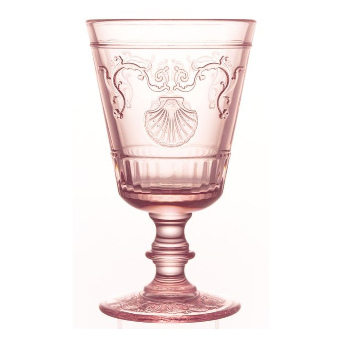 Kieliszek z bogato zdobionej kolekcji Versailles francuskiej marki La Rochère, wykonany z prasowanego szkła i ozdobiony reliefowymi motywami barokowych kwiatów, pnącej się roślinności i przegrzebków. Doskonale sprawdzi się do serwowania zarówno wina czerwonego, białego i różowego, wody, oraz zimnych i ciepłych napojów.
