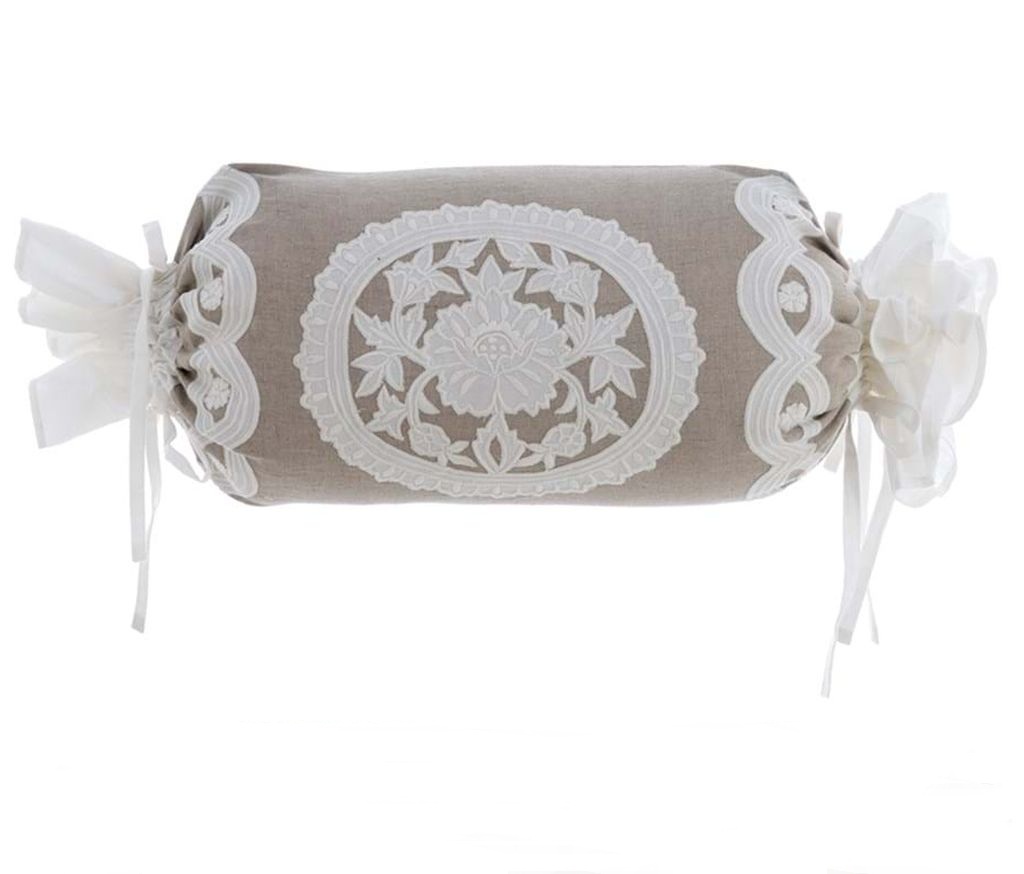 Romantyczna poduszka wałek, na brzegach wykończona pojedynczą bawełnianą falbanką, a pośrodku, ozdobiona bardzo eleganckim haftem. Idealna do dekoracji domu w stylu shabby chic lub prowansalskim. Model w komplecie z wyjmowanym wkładem.