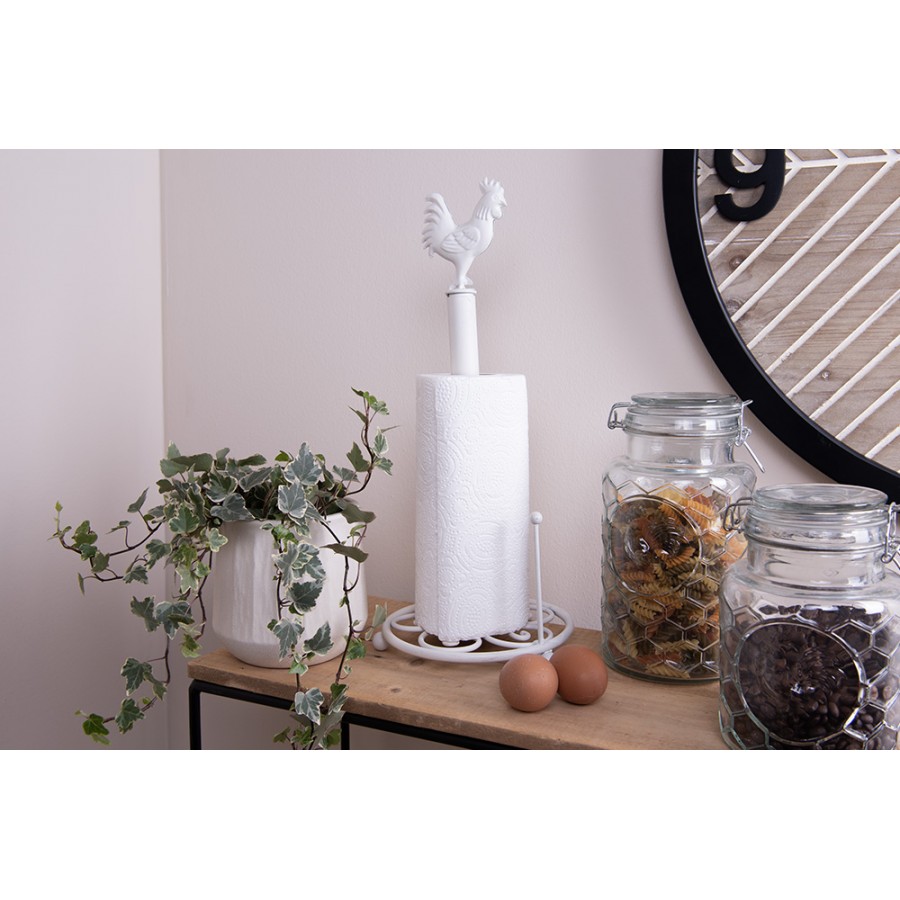 Elegancki stojak na ręczniki papierowe z motywem koguta. Praktyczna dekoracja stylowej kuchni.