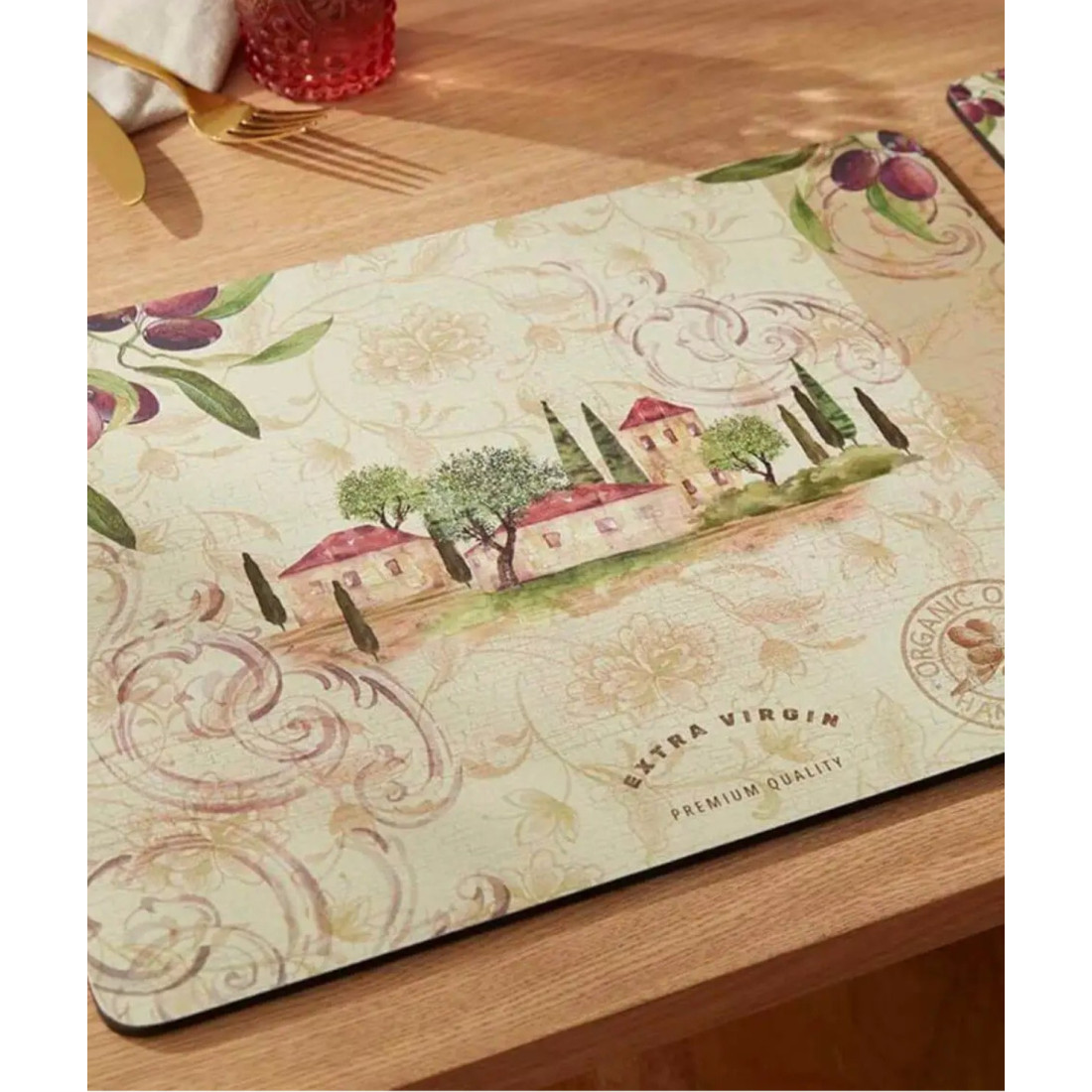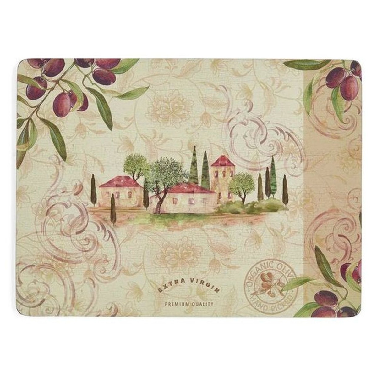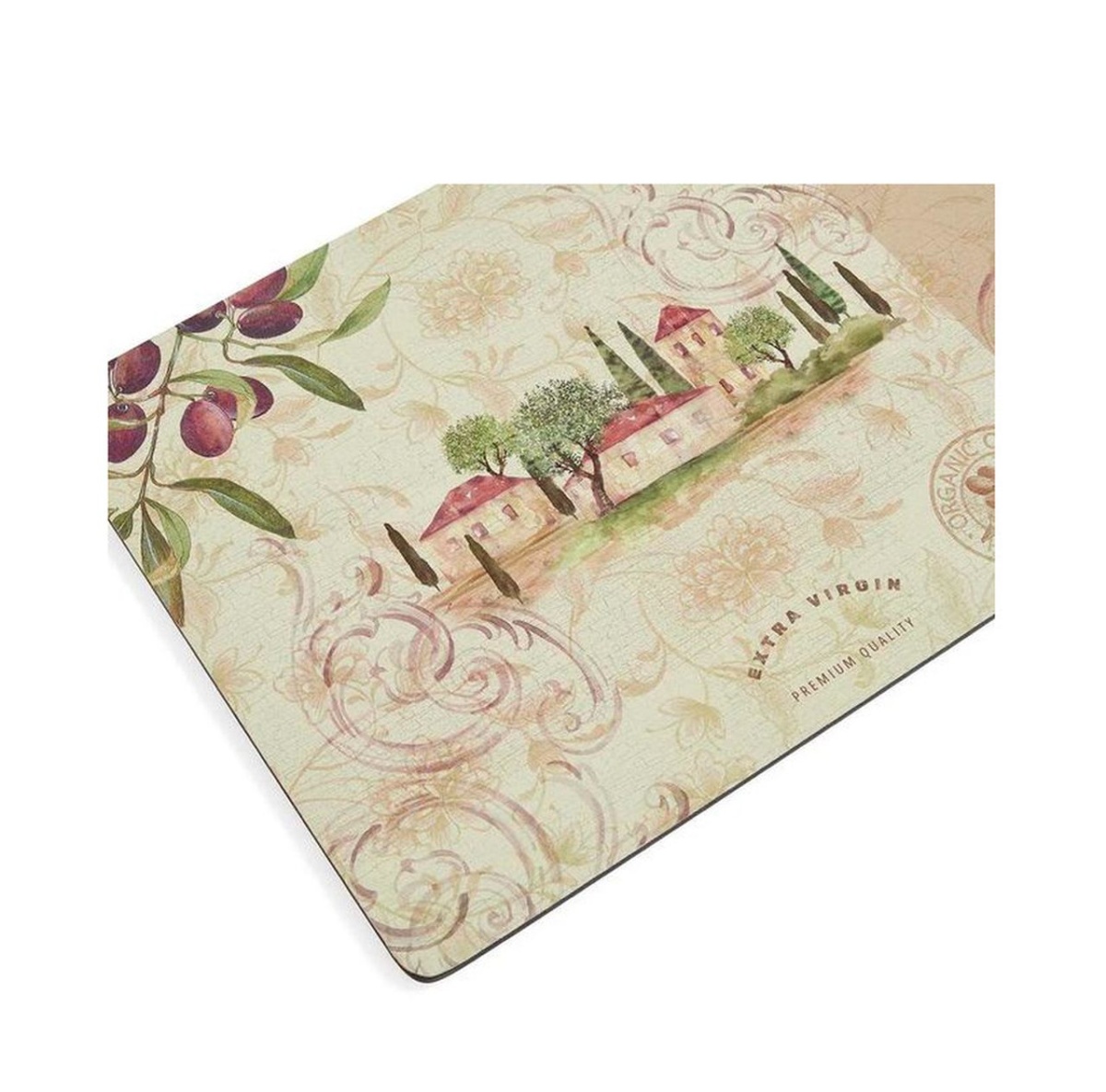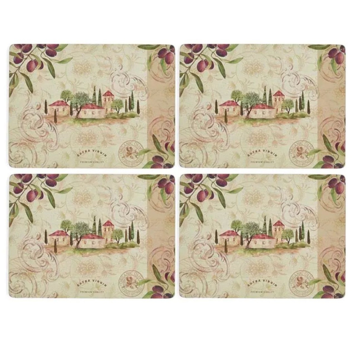 Zestaw czterech eleganckich i praktycznych podkładek korkowych marki Pimpernel, ozdobionych dojrzałymi gałązkami oliwnymi i sielską wiejską scenerią. Łączą styl z funkcjonalnością, a dzięki ponadczasowym wzorom i wysokiej jakości wykonaniu stanowią elegancką ozdobę stołu oraz świetny pomysł na prezent.
