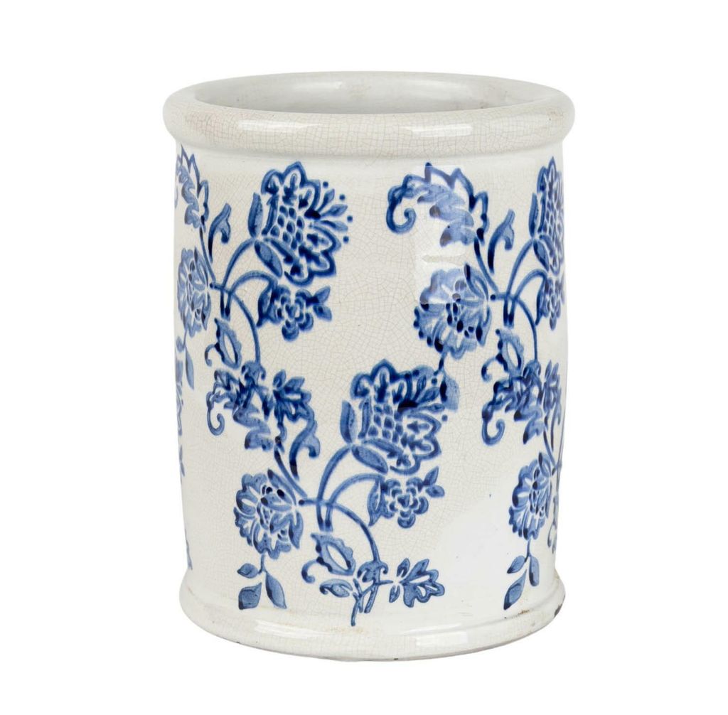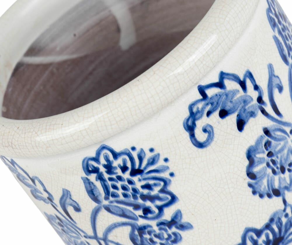 Piękny ceramiczny wazon z kolorowym motywem niebieskich kwiatów.