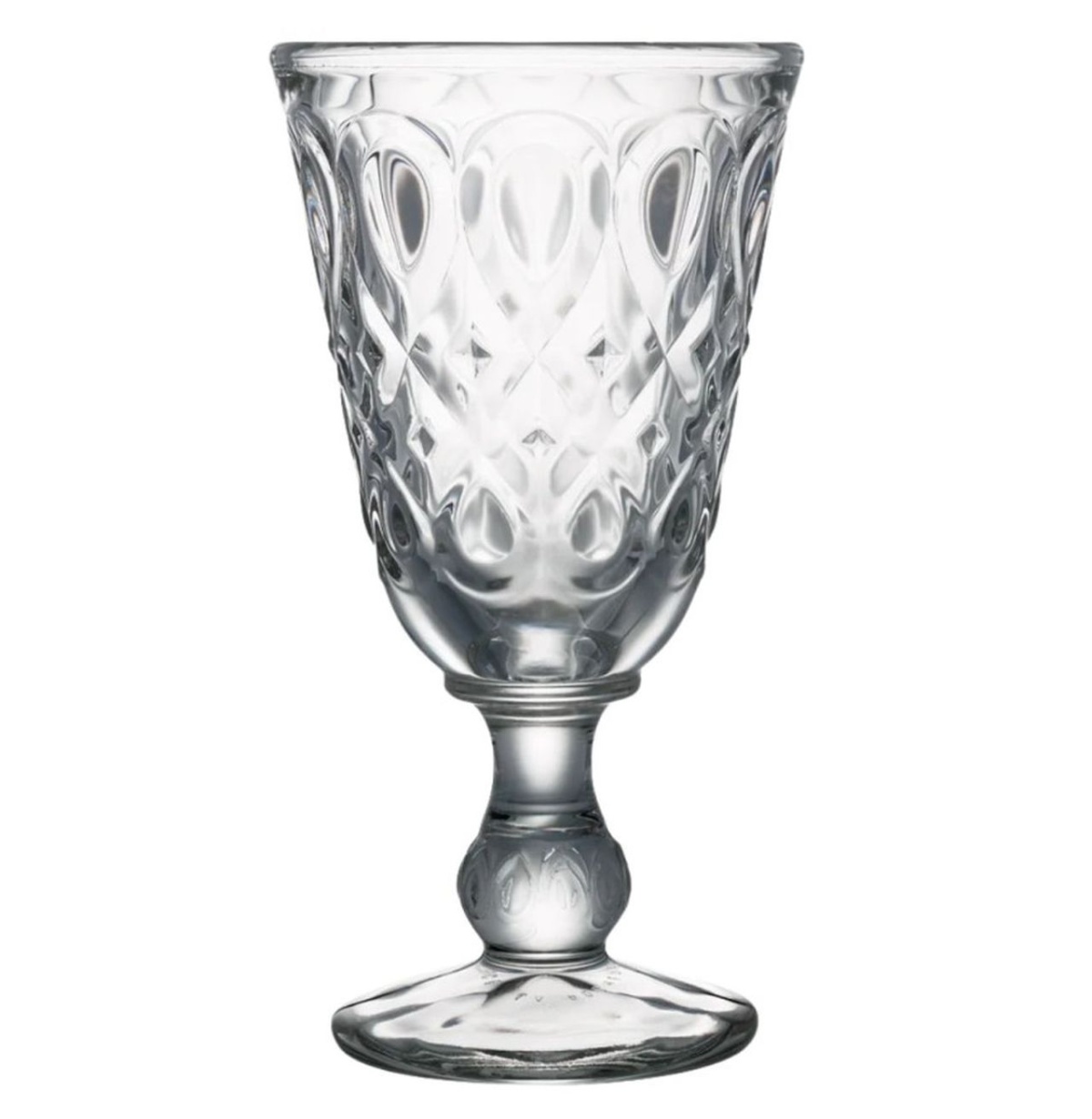Kieliszek z wykwintnej kolekcji Lyonnais francuskiej marki La Rochère, wykonany z prasowanego szkła i ozdobiony wypukłymi, przeplatanymi wzorami inspirowanymi renesansem. Doskonale leżący w dłoni, jest przyjemnie ciężki. Idealnie sprawdzi się do serwowania zarówno wina czerwonego, jak i białego, a także wody, soków oraz zimnych i ciepłych napojów.